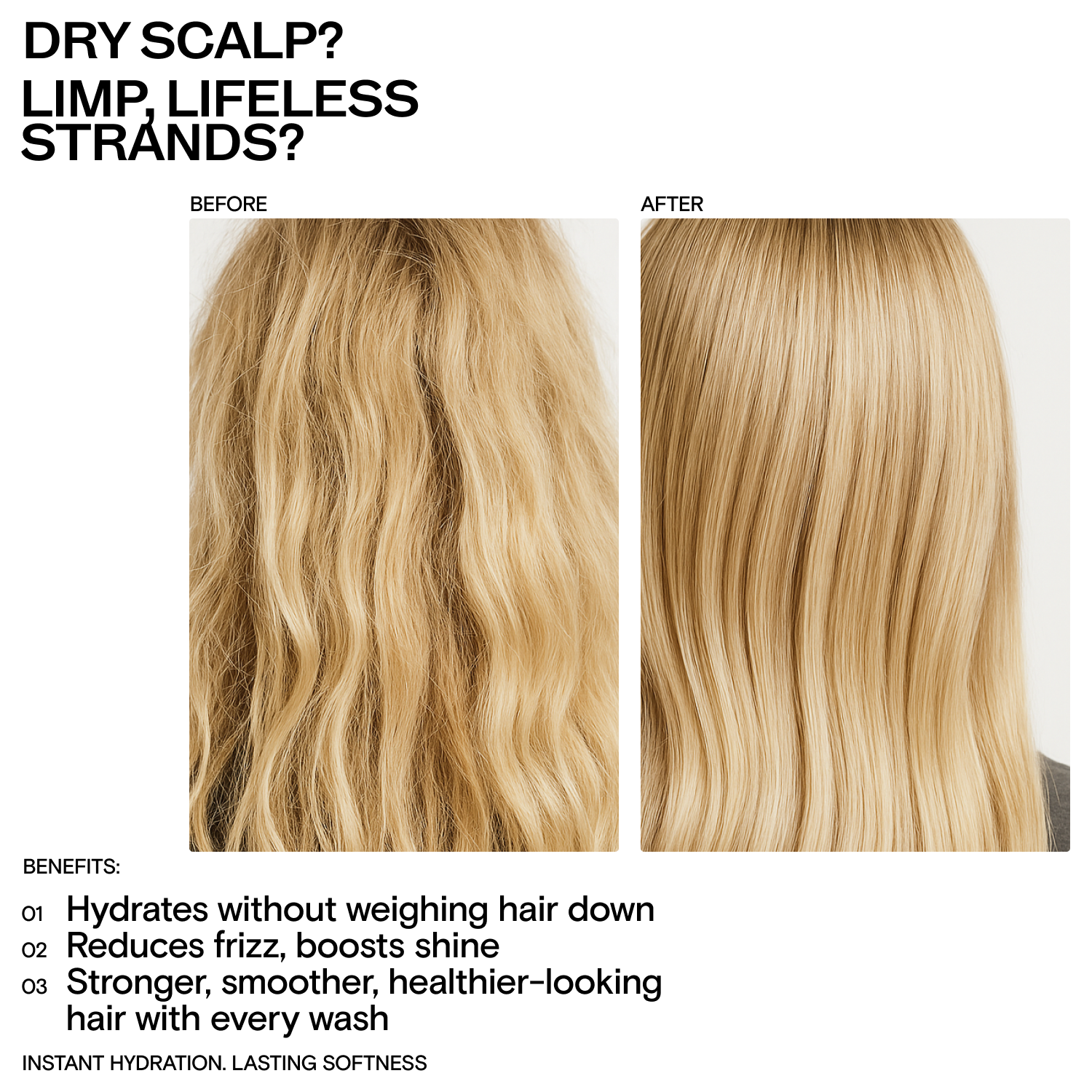 Turn dry, damaged hair into pure silk with our intensive moisture-restoring shampoo. Infused with powerhouse botanicals and microbiome-friendly probiotics, it instantly drenches thirsty strands, strengthens hair from root to tip, and rebalances your scalp. Feel the difference from the first wash—softer texture, brilliant shine, and noticeably healthier hair. Your ultimate hydration hero has arrived.